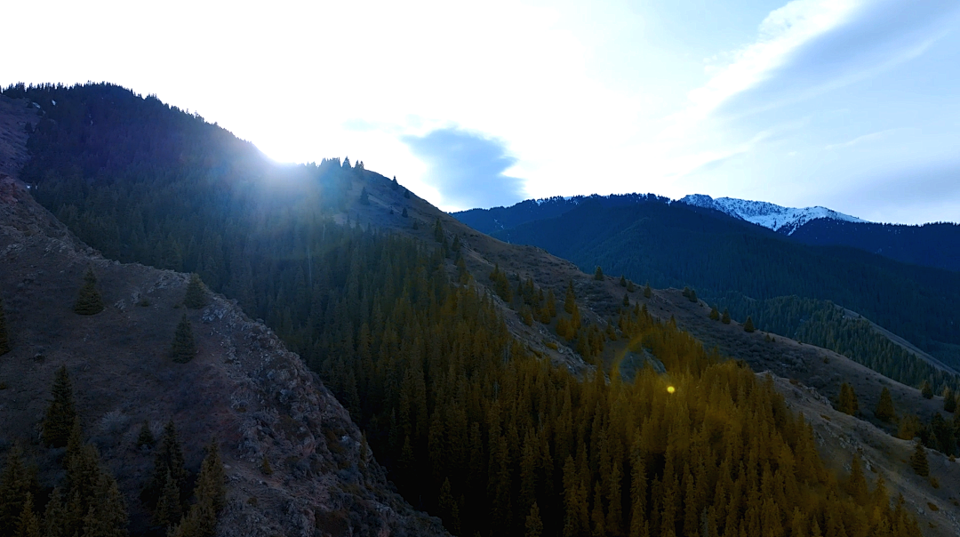 七十四团的清晨,美丽的朝阳、巍峨的雪山、高耸的树木,静谧而美丽,一阵哨声打破了这幅静止的画面。