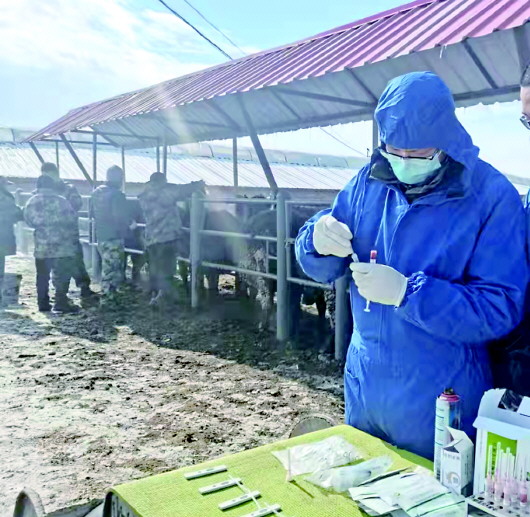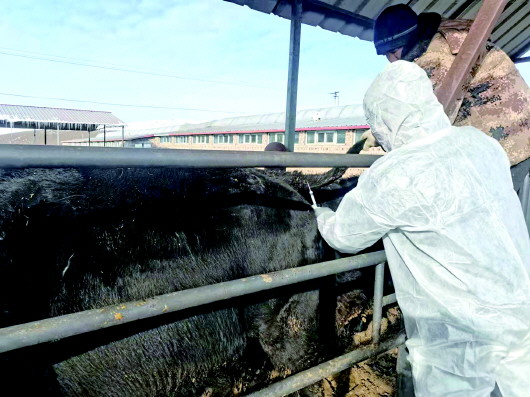 2月13日,可克达拉市创锦牧业有限公司的技术员在昭苏康苏养殖专业合作社,给牛作检查。这是该公司开展冬季送科技服务的一项措施,旨在为合作社解决生产中的技术问题,助力合作社提升养殖管理水平。