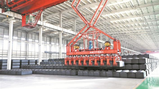在阿拉尔市南疆碳素新材料有限公司,工人操作天车码放预焙阳极生料块(资料图片)。近年来,一师阿拉尔市着力做强做优做大实体经济,加快形成新质生产力,目前已拥有高新技术企业28家、科技型中小企业23家、科学研究与开发机构15个,涉及制造业、新能源、新材料、农业生物技术应用等领域。 兵团日报常驻记者 林国强 摄