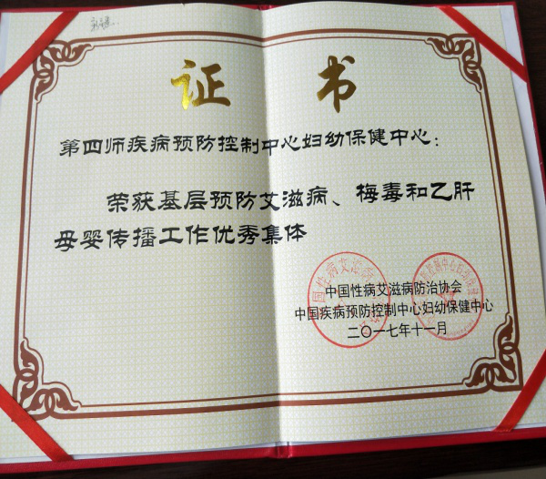 第四师妇幼保健中心深入学习贯彻落实国家艾滋病、性病等传染病防治工作方针、政策及法律法规,高度重视预防艾滋病、梅毒和乙肝母婴传播工作,把预防艾滋病、梅毒和乙肝母婴传播工作作为重要任务,并纳入年度绩效考核,在工作中不断积累经验,取得了显著成绩,荣获“预防艾滋病、梅毒和乙肝母婴传播工作优秀集体”,近期收到中国性病艾滋病防治协会颁发的奖牌和证书。四师妇幼保健中心将以此为契机,带动全师妇幼保健管理工作再上新台阶。