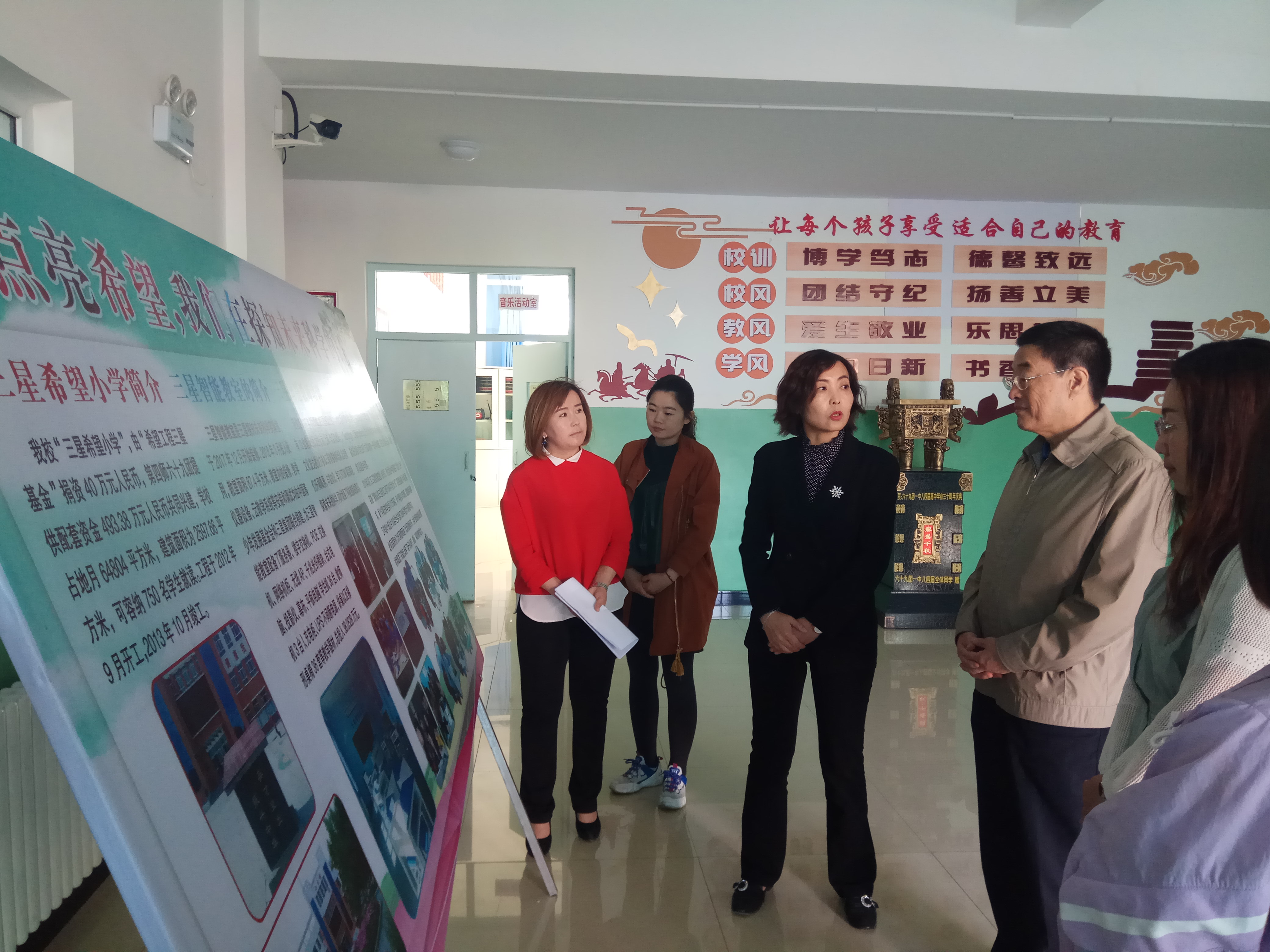 调研采取座谈交流、实地查看的方式展开调研,在中国青基会调研组一行先后深入到学校教室、学生食堂、宿舍、多媒体室、航模、体育、美术活动室等地,实地查看希望小学校牌、碑记及资金使用情况,了解软硬件设施配备情况,仔细询问了学校建设、师资条件、学生情况、学校特色及当前发展情况。