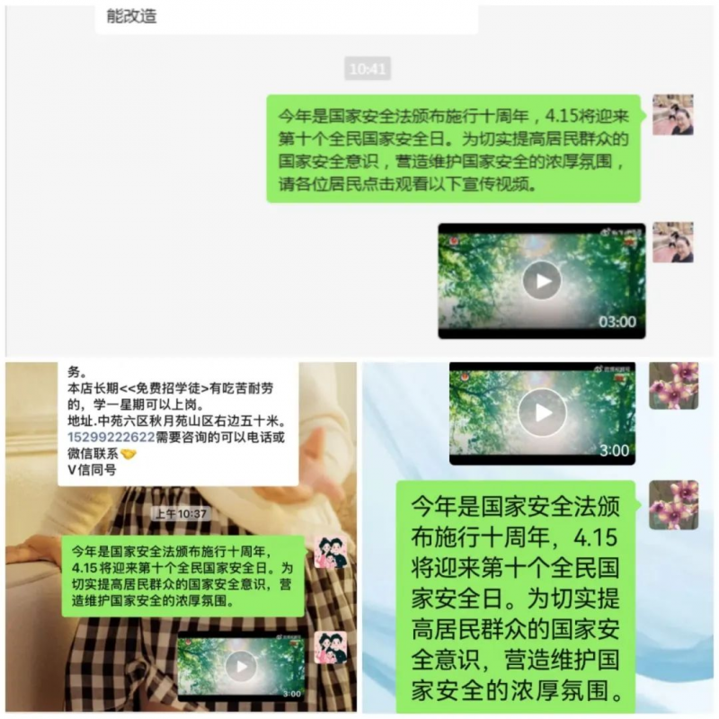 活动中,社区工作人员深入居民家中开展“敲门行动”,用通俗易懂的语言向居民讲解了《中华人民共和国国家安全法》《中华人民共和国反间谍法》等法律法规,普及了什么是12339、公民在维护国家安全中有哪些权利、日常生活中应警惕哪些危害国家安全的活动、如何维护国家安全等国家安全知识,使大家对国家安全的重要性有了更加深刻的认识。同时,采用“阵地+新媒体”宣传模式,在社区宣传栏张贴专题海报,利用居民微信群、智慧社区电子屏发布国家安全知识短视频、漫画等,有效提升居民群众对国家安全的关注度和认知度。活动累计发放宣传资料87份,张贴专题海报36张,推送各类宣传链接43条。(通讯员:梁祎喆、陆程程)