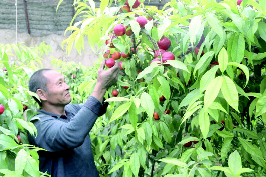 5月19日,六十六团十三连果农向贵勇正在温室大棚里采摘桃子。今年,该团种植桃子2227亩,预计产桃5500吨。该团采用套袋、微滴灌、生物防虫等种植新技术,种植的桃子具有个大、色泽金黄、果肉硬脆、口味甘甜的优点,备受市场青睐,以每公斤5元的价格,销往伊宁、博乐、奎屯、独山子等地。