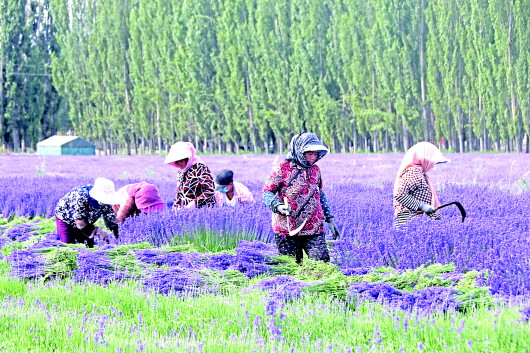 6月23日,七十团六连职工正在收割薰衣草。今年七十团共种植薰衣草5000多亩,目前陆续进入收割阶段。 张帅纲 摄