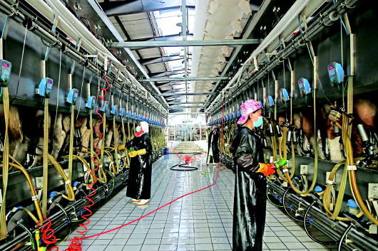 6月30日,伊犁创锦犇牛牧业有限公司挤奶车间内,工人们正利用智能化设备挤牛奶。该公司目前饲养奶牛1700多头,每天可产牛奶17吨。 张帅纲 摄