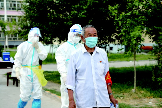 “下楼核酸采样了,请大家排好队,保持两米线距离……”8月11日,笔者在七十团临江苑小区看见,志愿者们正组织引导居民排队,其中满头银发却声音洪亮清晰的张庆煌格外引人注目。