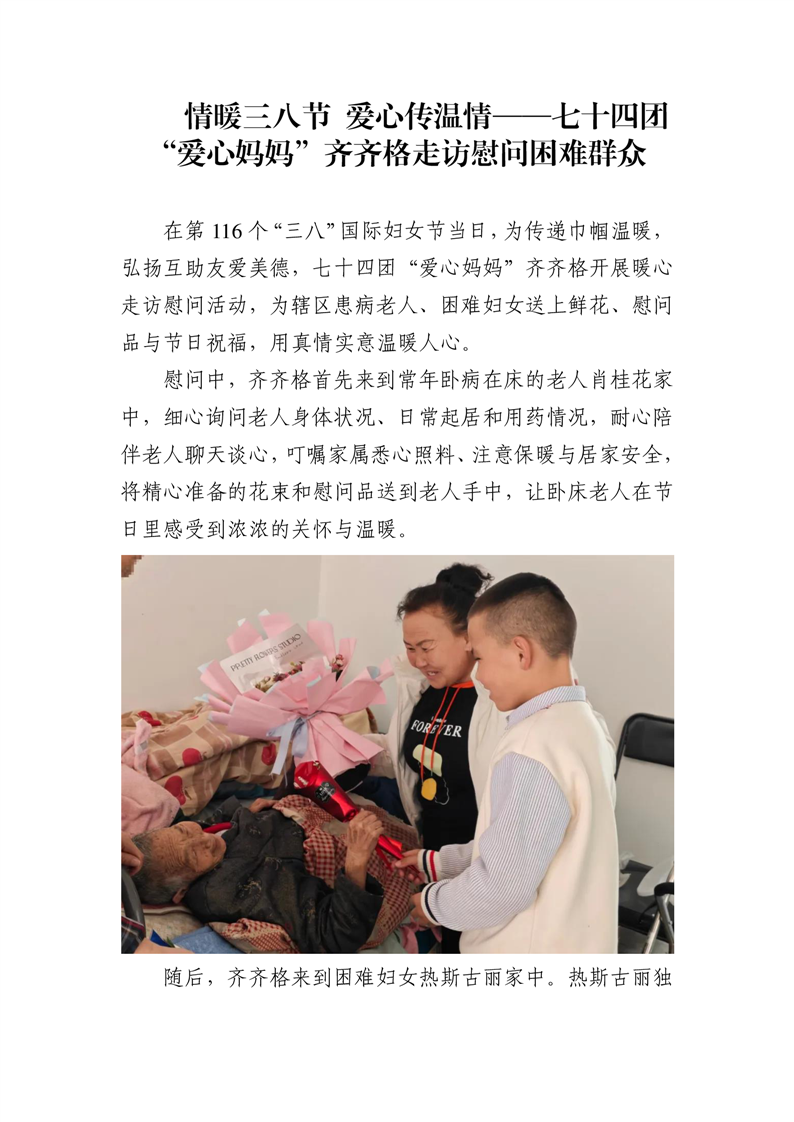 情暖三八节 爱心传温情——七十四团“爱心妈妈”齐齐格走访慰问困难群众