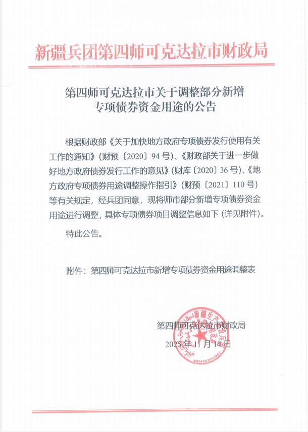 第四师可克达拉市关于调整部分新增专项债券资金用途的公告