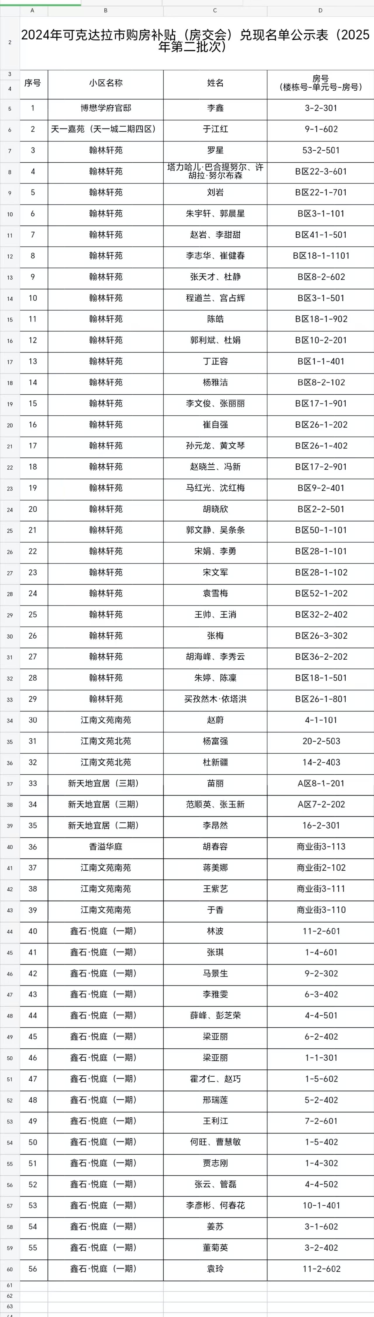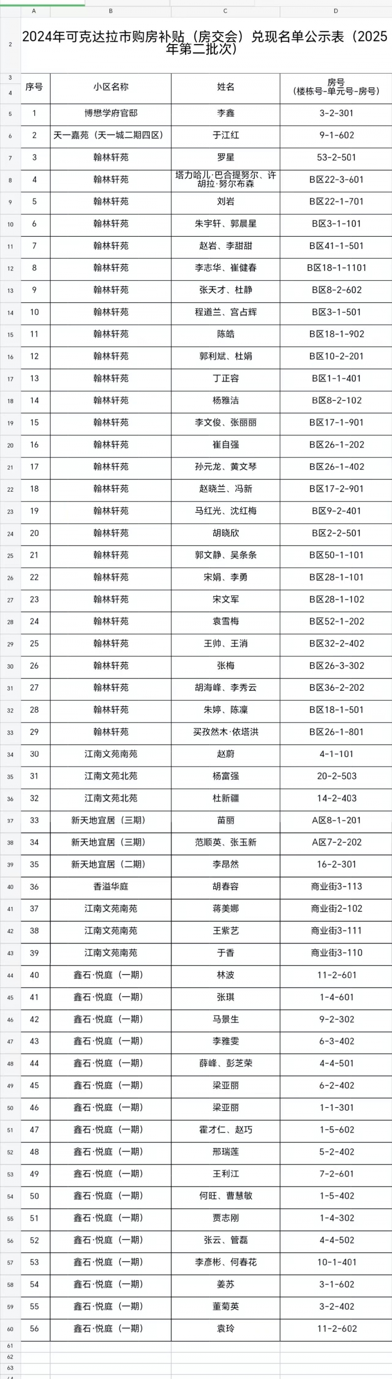 根据《2024年可克达拉市购房补贴方案》文件要求,对2024年9月26日至10月26日期间在可克达拉市核心区购买商品房签订网签合同并备案,住宅装修入住(师市各级党政事业单位、国企公职人员及其他财政供养人员需落户),商业装修营业后,可享受购房补贴。现对购买现房及网签合同日期为2024年年度内交房的商品房,兑现截止时间为2025年12月31日。2025年第二批次符合要求的56户名单公示如下,自本公示发布之日起5日内,任何单位或者个人,对公示名单若有异议,请将有关意见书面材料提交至所在社区。反映情况应实事求是,以单位名义反映情况的,应加盖单位公章;以个人名义反映情况的,应署明真实姓名、身份证号码、联系电话,逾期不予受理。
