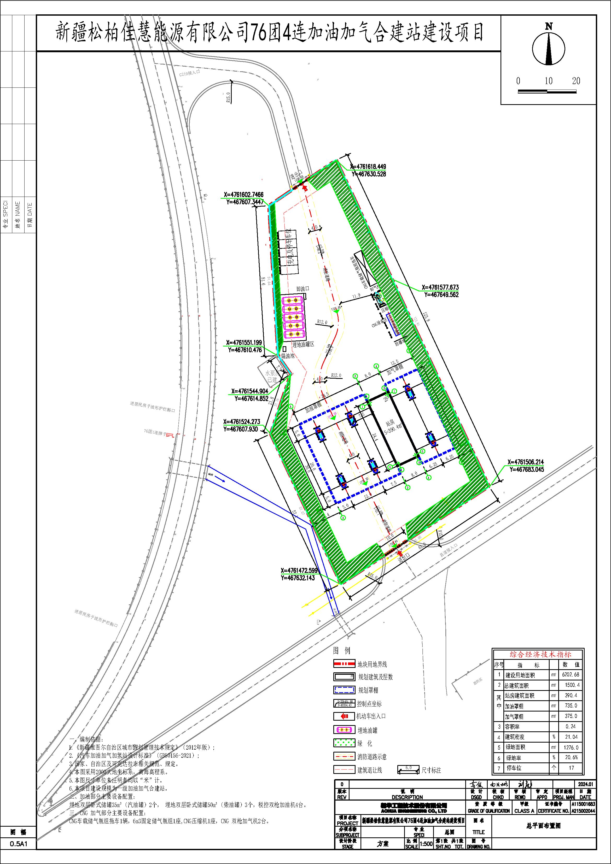 建筑规模:总建筑面积1500.4平方米,其中站房390.4平方米,加油罩棚735平方米,加气罩棚375平方米,配套停车场和绿化等附属设施。