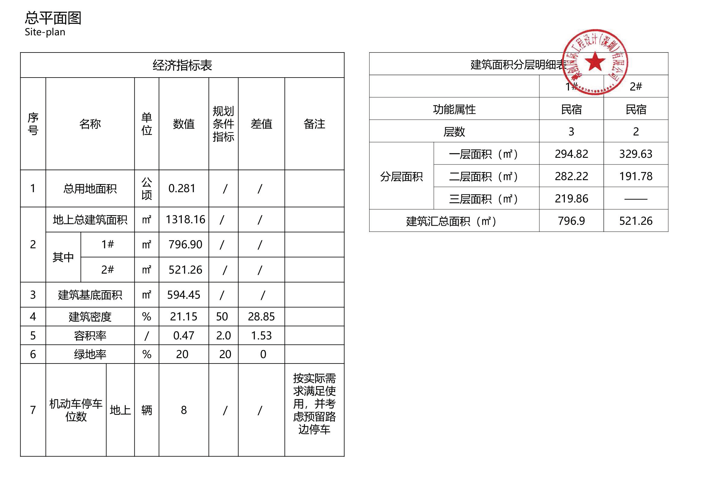建筑规模:总建筑面积1318.16平方米,新建1#民宿796.9平方米,2#民宿521.26平方米,及配套停车场和绿化等附属设施。