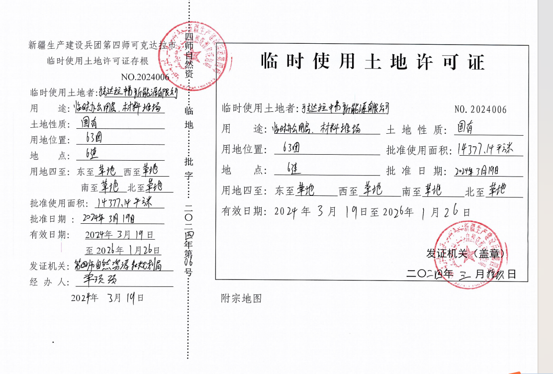 根据《新疆维吾尔自治区实施〈中华人民共和国土地管理法〉办法》和《关于进一步规范临时用地管理的通知》(兵自然资规〔2022〕1号)规定,第四师可克达拉市自然资源和规划局依法批准了可克达拉中弗新能源有限公司申请的临时用地1宗,现将有关信息公示如下: