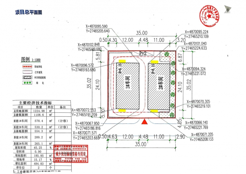 建筑规模:新建设两栋厂房,1#车间计容建筑面积578.4平方米,地上一层,地上高度8.15米(至檐口);2#车间计容建筑面积530.2平方米,地上一层,地上高度8.15米(至檐口)。