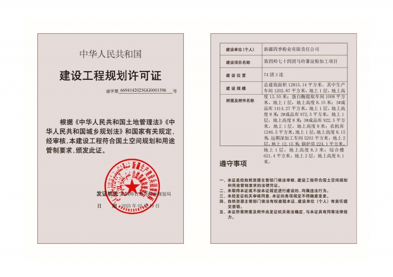 新疆四季粉业有限责任公司申请第四师七十四团马铃薯淀粉加工项目建设工程规划许可证变更,现将变更后证书内容公示如下: