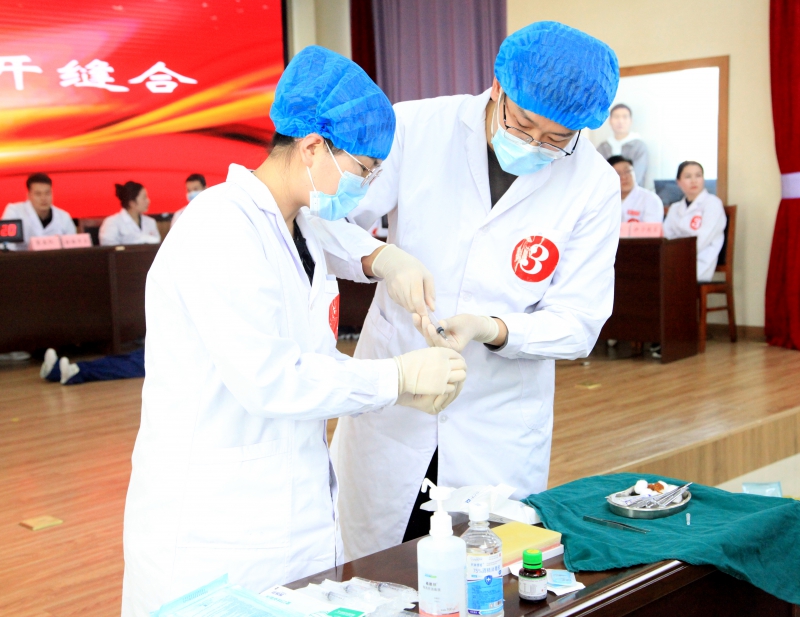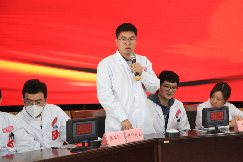 全场比赛由理论和实践操作两个部分组成,理论部分主要考核青年医师的三基知识、医疗核心制度(2022年版)、《医师法》、《“健康中国2030”规划纲要》以及习近平总书记关于医疗卫生系统的系列讲话精神掌握情况;实践操作考核青年医师心肺复苏和缝合打结的动手熟练程度。