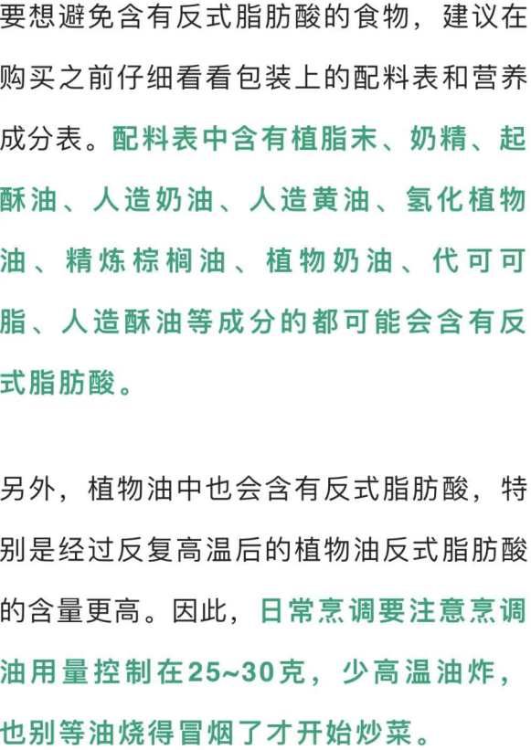 所以,《中国居民膳食指南》建议,每天反式脂肪酸的摄入量应不超过2克。含有反式脂肪酸的食物常见于:饼干、糕点、油饼、油条、膨化食品、咖啡伴侣、方便面、速冻食品、奶茶等食品。
