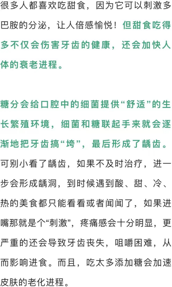 根据《中国居民膳食指南》中的建议,每人每天添加糖的摄入量最好别超过25克。添加糖不仅限于白砂糖、蔗糖、红糖、白糖、冰糖,很多食物配料表中添加的蜂蜜、果糖、果葡糖浆、玉米糖浆等也都属于添加糖。要想保护减缓皮肤和牙齿的衰老,含有这些添加糖字眼的食物都要尽量少吃!