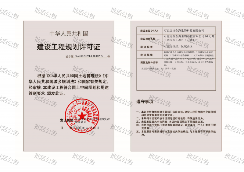 项目名称:可克达拉金海生物科技有限公司60万吨玉米深加工项目(二期)