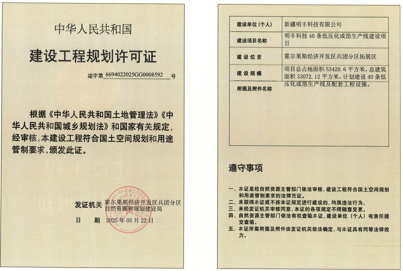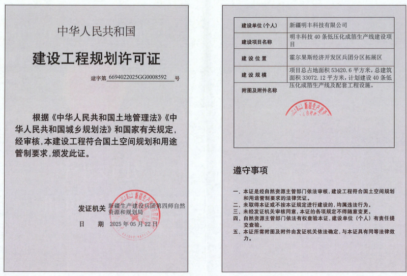 明丰科技40条低压化成箔生产线建设项目规划许可证