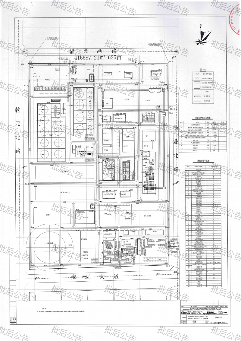 建筑规模:中央控制室建筑面积2288.45㎡,框架结构,地上1层,建筑高度10.7m;生产调度楼建筑面积1433.79㎡,框架结构,地上3层,建筑高度13.25m;中央化验室建筑面积2549.29㎡,框架结构,地上3层,建筑高度15.24m;综合办公楼建筑面积7340.31㎡,框架结构,地上5层,建筑高度23.8m;食堂建筑面积2661.93㎡,框架结构,地上2层,建筑高度10.85m;人流门建筑面积36.52㎡,框架结构,地上1层,建筑高度4.9m;供销中心建筑面积2143.02㎡,框架结构,地上3层,建筑高度11.75m。配套建设相关基础设施。
