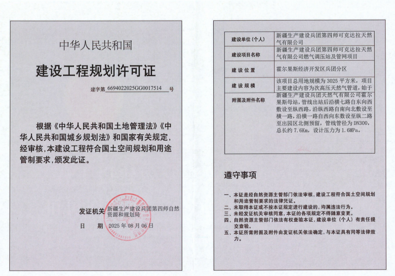 新疆生产建设兵团第四师可克达拉天然气有限公司燃气调压站及管网项目规划许可证批后公告说明