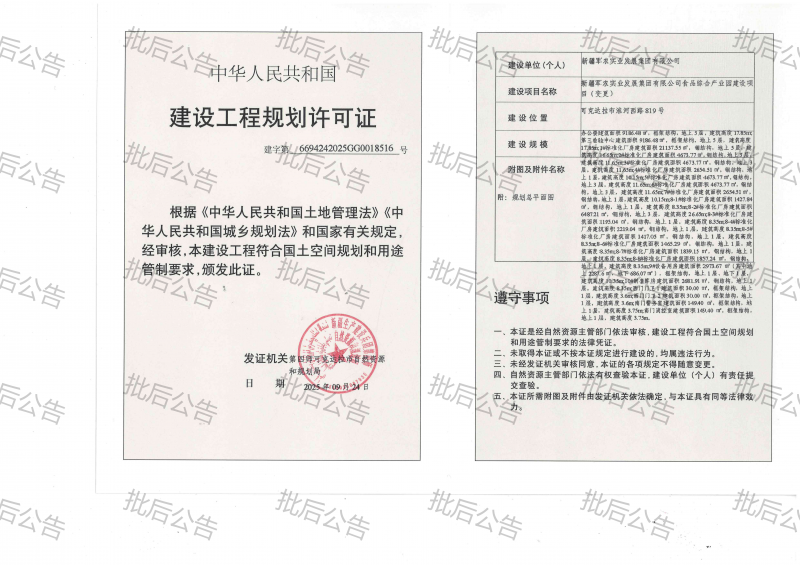 新疆军农实业发展集团有限公司来文申请办理新疆军农实业发展集团有限公司食品综合产业园建设项目建设工程规划许可变更。根据《中华人民共和国城乡规划法》第四十条的规定,现将变更后的建设规模及总平面图(详见附件)予以公布,原《建设工程规划许可证》(建字第659008202200102号)作废。现将变更事项公示如下: