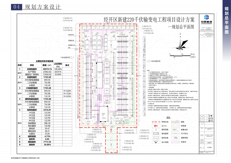 建筑规模:新建220千伏变电站1座,主变容量2x240MVA,220千伏主接线建成双母线接线及4回出线,110千伏主接线建成双母线接线及4回出线:35千伏主接线建成单母线分段接线及10回出线。其中:35kv配电装置室建筑面积850.50㎡,框架结构,地上1层,建筑高度6.8m;泵房建筑面积132.3㎡,框架结构,地上1层,建筑高度6.0m;二次设备综合楼建筑面积761.08㎡,框架结构,地上1层,建筑高度5.0m;配套建设相关专业设备构筑物及基础设施。