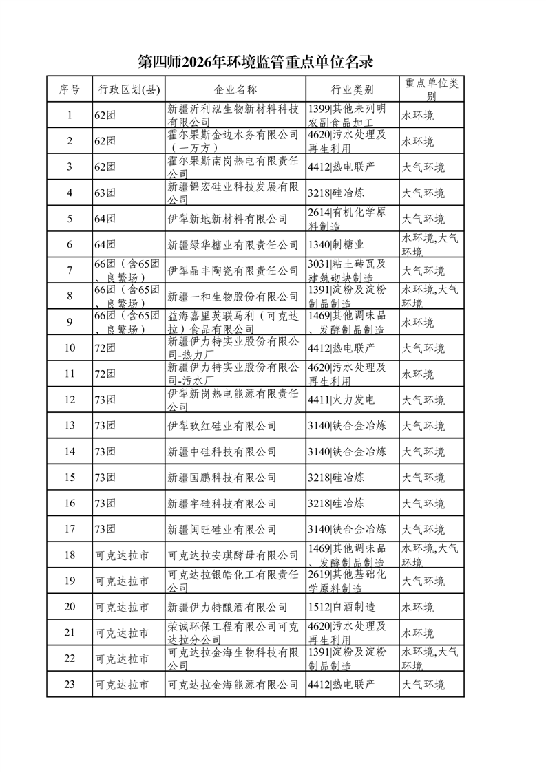 第四师2026年环境监管重点单位名录
