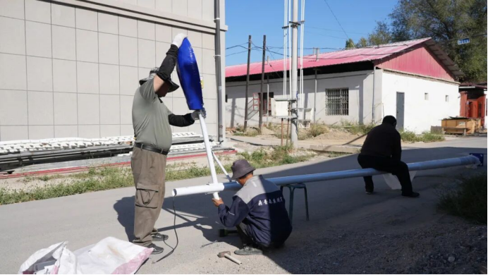 9月15日,记者在六十二团光明社区建设路看到,工人们正加紧进行太阳能路灯安装作业。此次该团推进的1000盏太阳能路灯安装工程,不仅精准解决了辖区平房区域夜间照明缺失问题,更以绿色节能方式提升居住环境的安全性与舒适度。