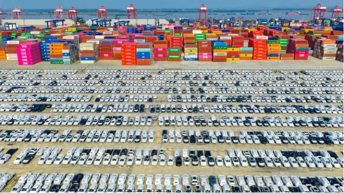 2025年10月4日在江苏省港口集团南京港龙潭港区拍摄的准备装船出口的汽车(无人机照片)。新华社发(杨素平摄)