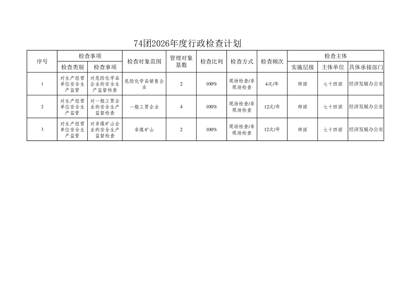 74团涉企行政检查年度计划